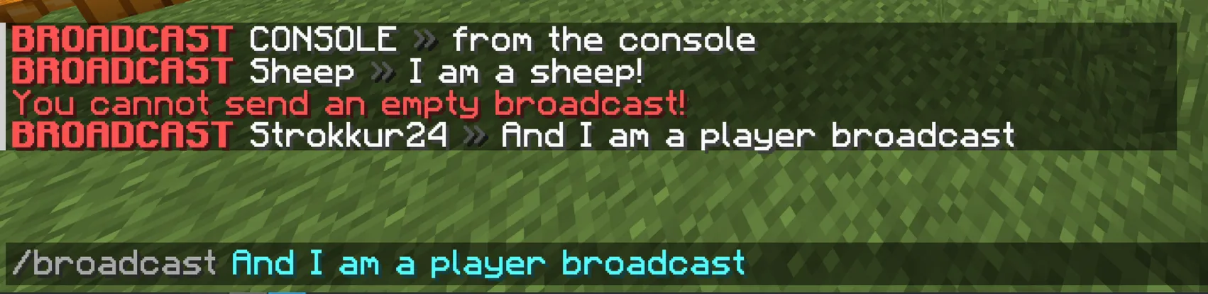 @Overridepublic void onEnable() {    registerCommand("broadcast", new BroadcastCommand());}And this is how it looks like in-game: